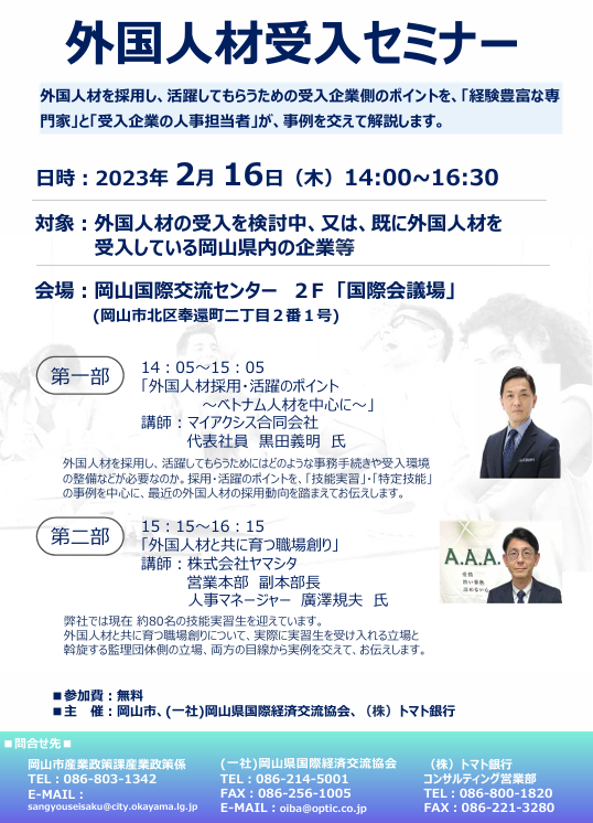 外国人材受入れセミナー”へ登壇 岡山市、(一社)岡山県国際経済交流協会、トマト銀行主催2023年2月26日